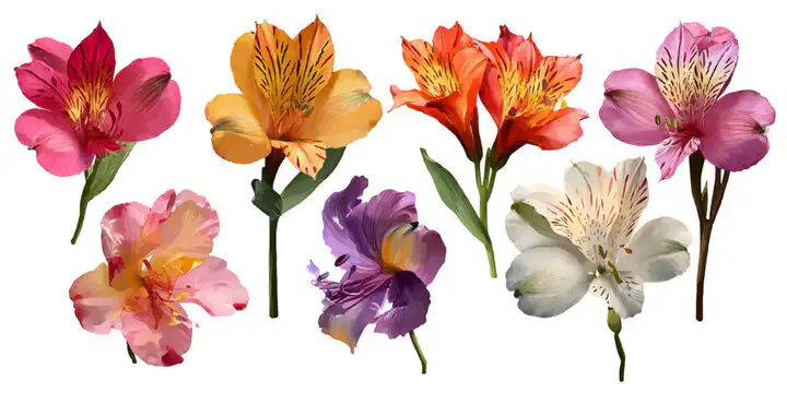 - Flower details: Blooms are 1–2 inches across with six petals, often streaked, spotted, or flecked in contrasting darker tones, appearing in umbels of multiple flowers per stem in colours like red, orange, pink, purple, yellow, salmon, or white.