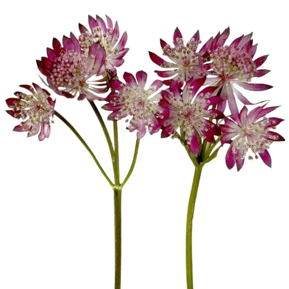 Astrantia, commonly known as masterwort, is a clump-forming herbaceous perennial in the Apiaceae (carrot) family, native to Europe’s mountain meadows and woodland edges, prized for its intricate, star-shaped flower heads that blend seamlessly into cottage and shade borders. These elegant plants grow 30–90 cm tall with deeply lobed, glossy basal foliage and wiry stems bearing umbels of tiny florets (2–4 cm across) surrounded by papery, petal-like bracts in shades of white, pink, red, maroon, or green-tinged, blooming from late spring through autumn to support early and late pollinators.