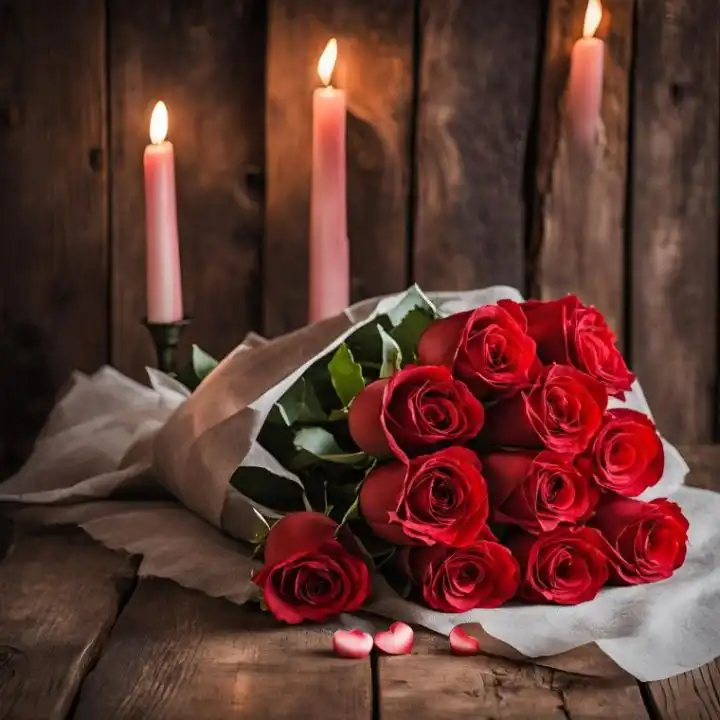 This floral arrangement features eleven premium fresh crimson roses. Skilled florists hand-tie each bundle to create a rustic look. Natural green leaves provide a fresh feel to the gift. It comes wrapped in textured craft paper and soft tissue. Tiny heart ornaments and candlelit accents add a romantic touch. These real flowers help express deep love and devotion.