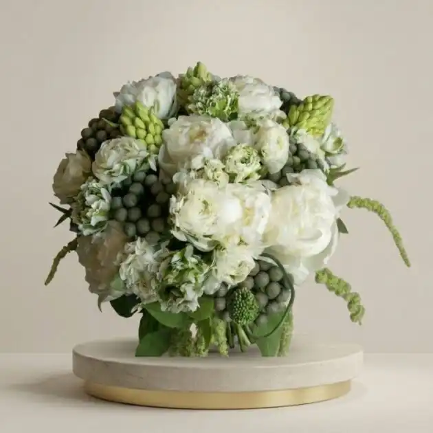 This luxury arrangement brings a clean and peaceful feel to any space. Our expert florists handcraft each white ranunculus and peonies bouquet using the freshest seasonal stems. It features lush white blooms and silver-grey accents for a premium look. These flowers create a sense of calm and elegance for your loved ones.