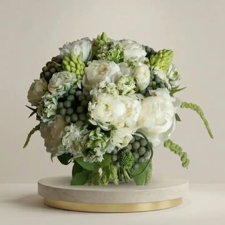 This white ranunculus and peonies bouquet wedding style arrangement fits many special moments. It serves as a thoughtful gift for a wedding anniversary or a surprise for a partner. The soft white tones also make it a great choice for get well flowers. It brings comfort to a room and shows you care.