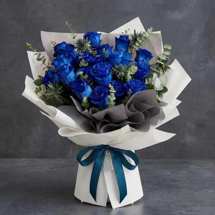 This blue roses bouquet makes a bold statement for birthdays. It is a thoughtful gift for Mother’s Day or Valentine’s Day. The royal blue tones suit summer parties and festive gatherings. Use these flowers to show someone you care with a rare gift.