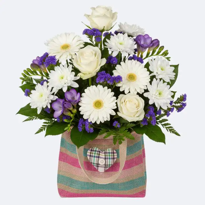This floral mix features crisp white roses and bright gerberas. Soft purple freesias add a lovely scent to the bunch. Each bloom is fresh and organic to help you celebrate. The arrangement sits inside a stylish patterned carrier. A small heart charm hangs on the front for a sweet touch. It brings a feel of elegance to your home or office.