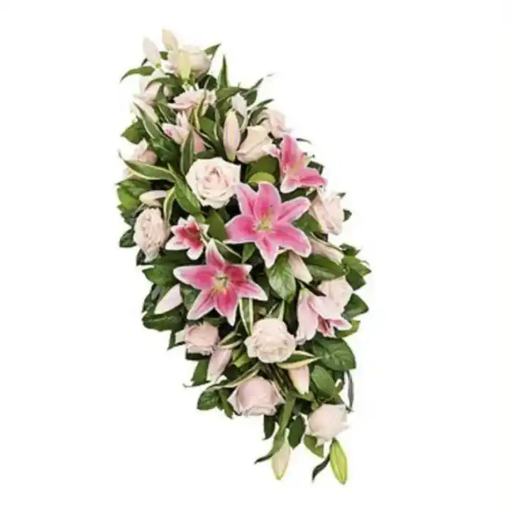 Honor your loved one with this Radiant Pink Lily & Rose funeral flowers casket spray. Skilled florists hand-tie each arrangement to create a balanced teardrop shape. The mix of soft blush and cream tones offers a peaceful look for the service. We use farm-fresh stems to provide lasting beauty during a difficult time.