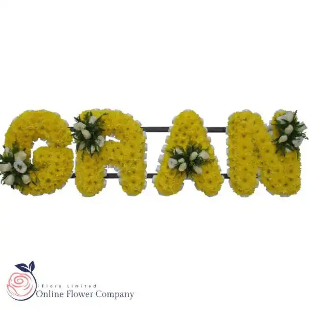 This heartfelt Grandad Funeral Flowers on a Stand tribute is a touching way to honor the memory of a beloved grandfather. It features a beautiful floral arrangement spelling out “Grandad,” crafted with vibrant Yellow Chrysanthemums, symbolizing friendship and remembrance. Furthermore, the tribute is accented with Blue Irises, representing faith and hope.