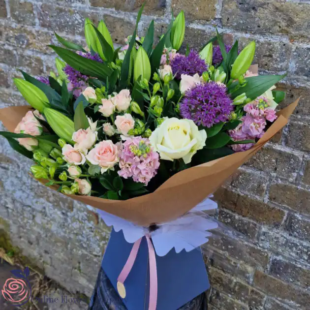 The Roses and Lilies Bouquet is a refined and romantic arrangement, featuring soft pink roses, elegant white lilies, and a touch of purple statice, complemented by fresh green foliage, likely eucalyptus. This stunning bouquet is ideal for expressing love, admiration, and appreciation, making it a perfect choice for birthdays, anniversaries, Mother’s Day, or any special event. The flowers are hand-tied in a loose arrangement, and wrapped in brown paper for a natural and elegant presentation.