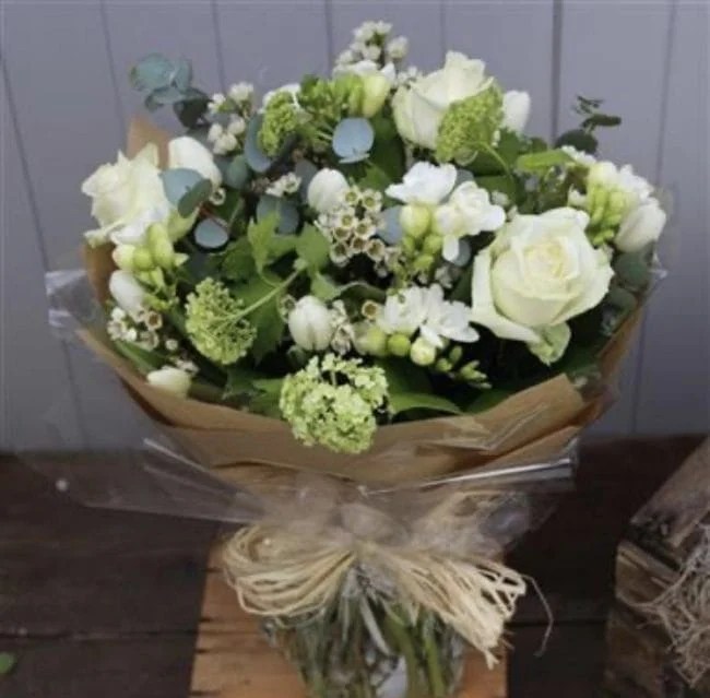 Hand-tied and wrapped in rustic brown paper with twine, it offers a refined yet charming look. Ideal for expressing love, innocence, and new beginnings, this bouquet makes a thoughtful gift.