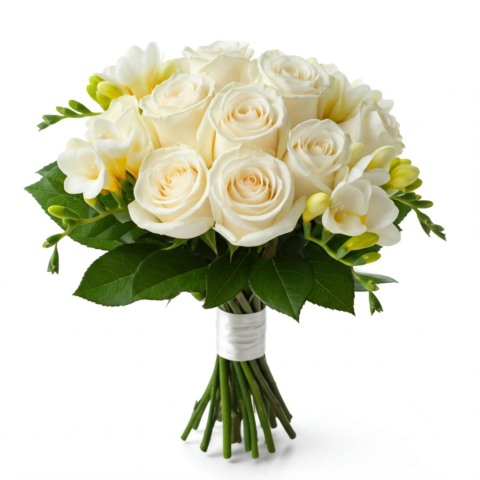 The White Rose Freesia Bouquet features white roses, freesia, lisianthus, wax flower, and cream spray roses, complemented by eucalyptus greenery. This elegant bouquet symbolizes purity and simplicity, making it perfect for weddings, bridal showers, baby showers, or sympathy arrangements.