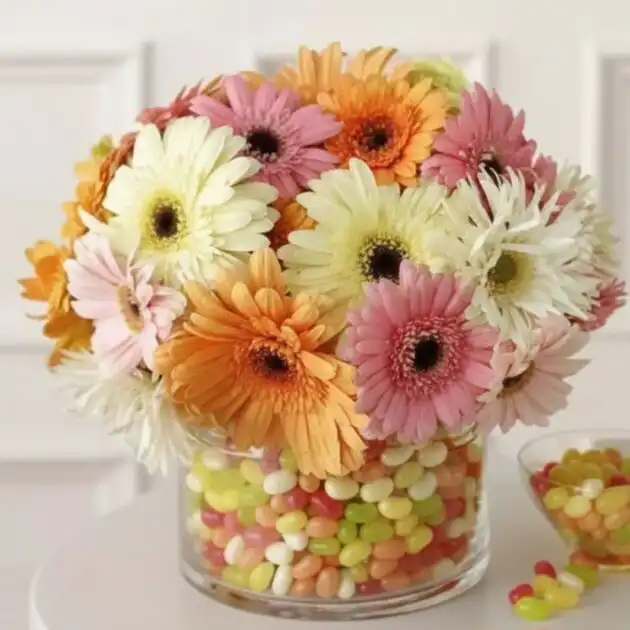 This fresh floral set brings a playful touch to any room. Skilled florists handpick premium blooms to create a rounded look. The clear glass vase holds more than just water. It features bright jelly beans for a unique style. This mix of peach and pink tones adds joy to any space.