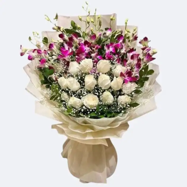 This arrangement works well as a summer flower gift or to say thank you. It is a great choice for a White Roses and Purple Orchid Bouquet wedding theme. You can send it for birthdays or anniversaries to show you care. It also makes a beautiful surprise for home decoration.