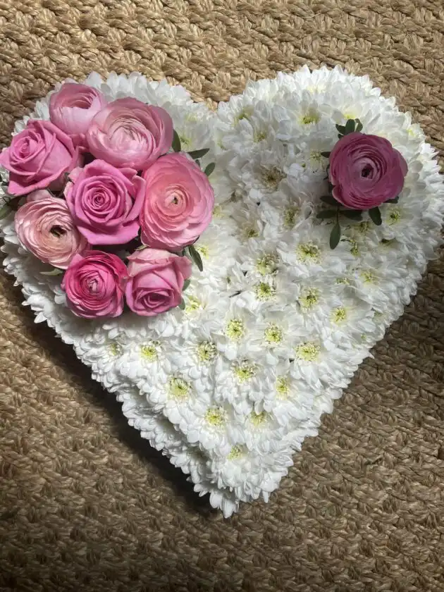 White Chrysanthemum and Pink Rose Funeral Heart Tribute