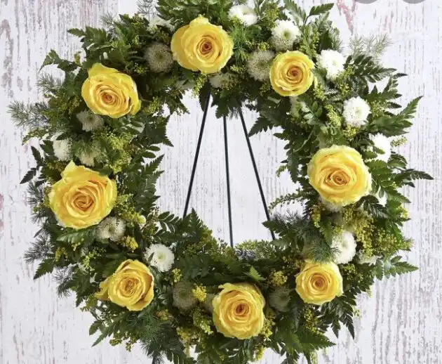 This radiant Fresh Flower Funeral Wreaths is a beautiful and comforting tribute. It features vibrant Yellow Roses, symbolizing friendship and remembrance, and delicate White Chrysanthemums, representing peace and sympathy. Besides, These blooms are artfully arranged with lush greenery, creating a vibrant and heartfelt display.