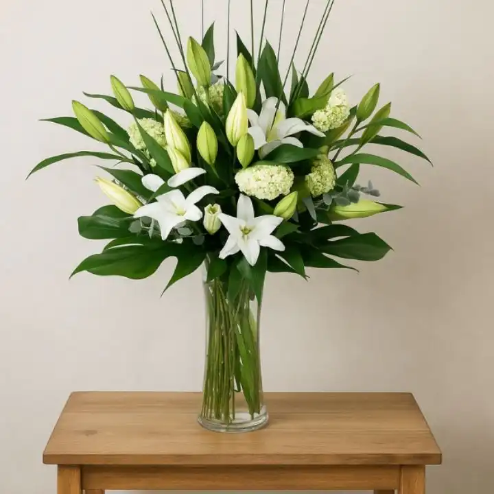 This white and green bouquet serves as a thoughtful gift. It is a proper choice for sympathy and funeral tributes. The clean colors offer comfort to friends or family members. You can also use it for home decoration to add a fresh look. It makes a kind surprise gift to say thank you.