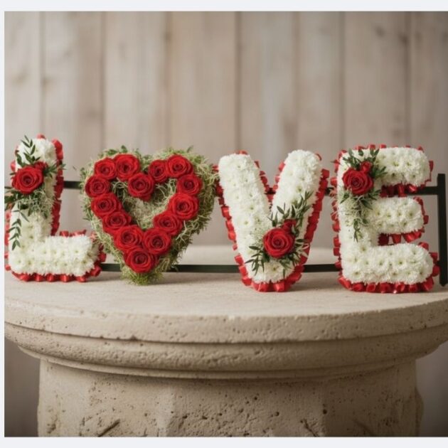 This Tribute love Letter uses 100% genuine blossoms. Skilled florists handcraft each piece with care. It features white chrysanthemums and deep red roses. The design honors your loved ones with dignity. A green moss base holds the floral heart. This arrangement suits funeral services or memorial displays. It offers a clean and modern look. Each stem stays fresh for a long time.