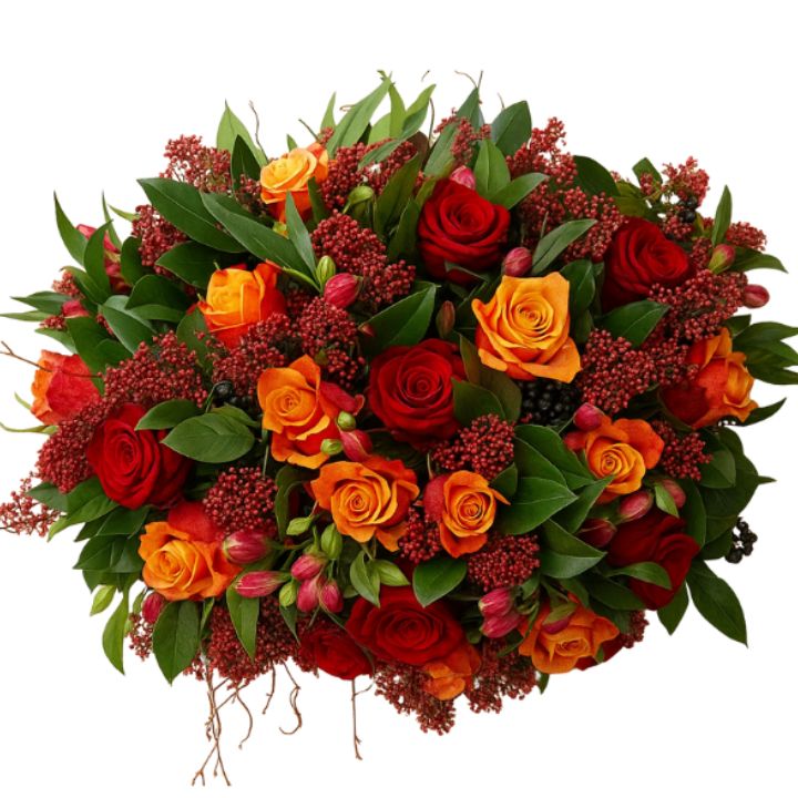 With the finest autumnal bouquet flowers, a combination of red and orange roses is paired alongside vibrant green leaves, delicate berries and textured tulips. Every flower is thoughtfully chosen for its freshness and uniqueness which enables a seasonal beauty all year round.