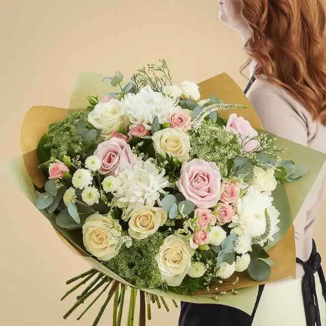 This beautiful luxury bouquet features a delicate mix of soft pink and white flowers. It includes elegant roses and fluffy chrysanthemums, along with smaller filler flowers and abundant greenery. The arrangement is hand-tied and wrapped in natural brown paper, making it a beautiful and heartfelt way to express your condolences.
