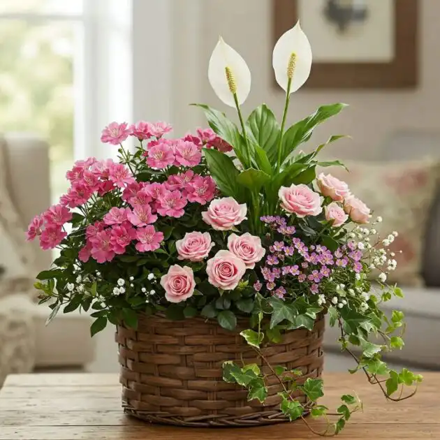Our Enchanted Garden brings nature home. This basket features stunning fresh flowers. Pink roses add a touch of elegance. White peace lilies create a calm feel. These mixed flower pot arrangements look beautiful.
