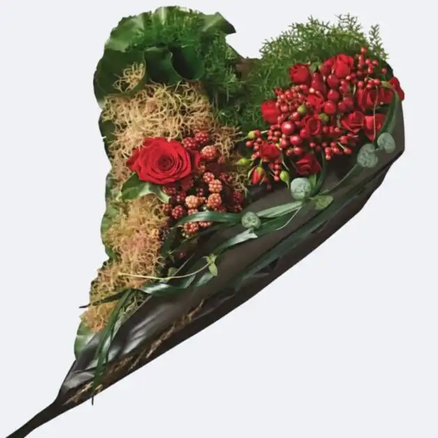 Offer a respectful and beautiful final tribute. This Red Rose Heart Funeral Tribute expresses deep love and lasting memory. Our skilled florists handcraft this arrangement using only the freshest, high-quality botanical items. The design features rich red roses and textured natural greens. This piece is a moving expression of sympathy and heartfelt loss.