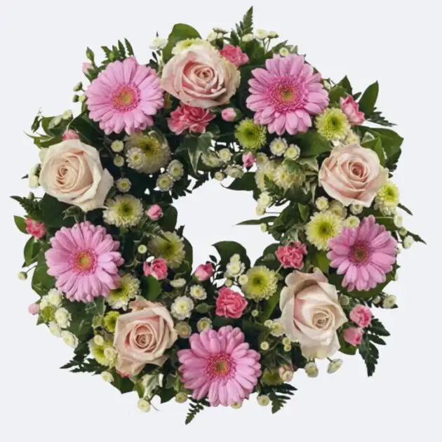 This tribute offers comfort during a hard time. Local florists make each Pink and Cream Funeral Wreath by hand. Fresh gerberas and roses bring a soft feel. It shows love and respect for a lost friend. Every arrangement looks classic and natural. Save money when you buy online today. We offer an instant 12 % discount for web orders. Contact our support team for an extra 10 % off code. Ask the chat team for this special coupon.