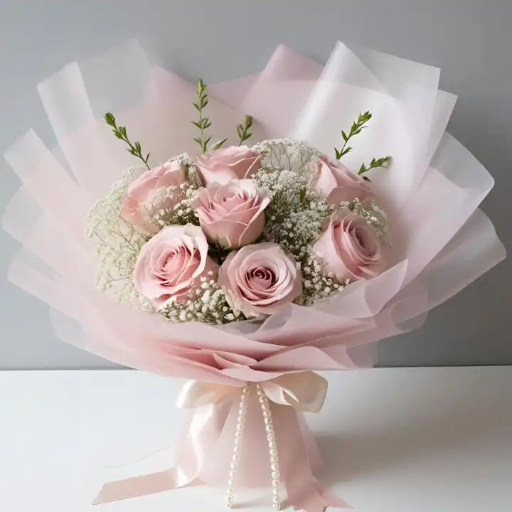 This floral arrangement brings a soft and elegant feel to any space. It features seven fresh pink blooms and three peach blossoms. Professional florists assemble each piece by hand to ensure a full look. White filler flowers and green buds add a natural touch. This gift helps you share joy during special moments.