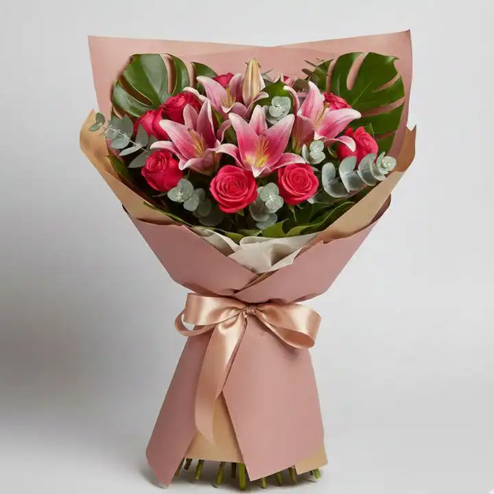 This fresh floral arrangement brings natural beauty to your home. Our florists hand-tie every Pink Rose & Oriental Lily Bouquet with care. The mix of bright pinks and greens creates a luxury feel. These real flowers stay fresh for a long time.