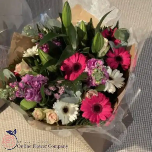 The Mixed Flower Bouquet Birthday is a stunning arrangement of colorful flowers, including pink gerbera daisies, white lilies, pink roses, and purple statice, all complemented with green foliage. This bouquet is ideal for birthdays, anniversaries, or any occasion that calls for a burst of joy and beauty. The flowers are hand-tied and wrapped in brown paper for a rustic yet elegant look. It’s a versatile gift that can brighten anyone’s day, bringing a smile to the recipient’s face.