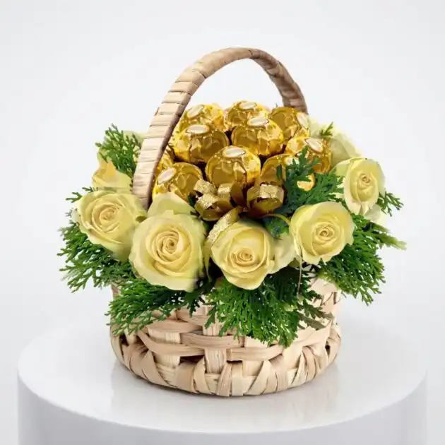 This gift combines fresh cream roses with gourmet gold chocolates. Our local florists handcraft each basket to create a classic look. It brings a touch of elegance to any special celebration. You will find six fresh blooms mixed with eight sweet treats. Fresh cedar leaves add a natural green feel to the arrangement.
