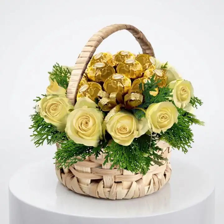 The basket usually contains a beautiful arrangement of fresh roses in a variety of colors, along with a selection of high-quality chocolates or other treats. The combination of the sweet scent of roses and the indulgent taste of chocolates creates a sensory experience that is sure to delight the recipient.