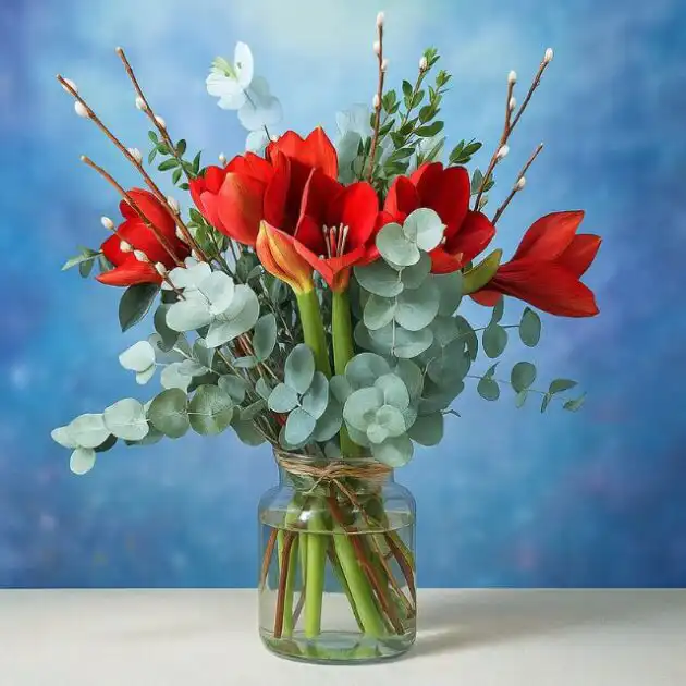 Celebrate the festive season with bold elegance using our Simply Red Amaryllis. Featuring vibrant red blooms paired with soft eucalyptus and tall pussy willow stems, this hand-tied bouquet is one of the finest red amaryllis cut flowers available. Perfect for your home, table centerpiece, or as a luxurious gift, it brings warmth, color, and festive charm wherever it is displayed.