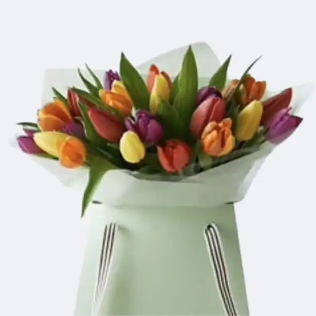 Bring bright joy to any event with this stunning gift. This Tulip Bouquet Gift Bag holds fresh, multicoloured blooms. Expert florists hand-tie the selection for a modern look. It’s the perfect way to show you care.