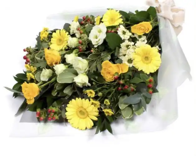 This hand-tied funeral sheaf bouquet features a peaceful mix of fresh yellow roses and bright gerberas. Our local florists arrange these 100% natural blooms with white lisianthus and chrysanthemums to create a classic tribute. We add green eucalyptus and red berries to provide a respectful look for any memorial service. It is available in standard and luxury sizes to help you express your deepest sympathy.