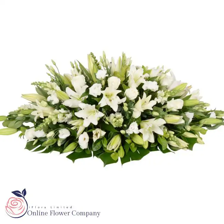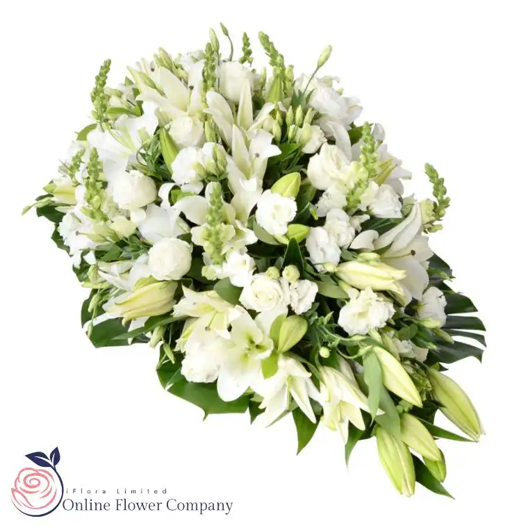 White Coffin Spray Flowers arrangement is a touching tribute to honor the memory of a loved one. It features pristine white lilies, symbolizing purity and rebirth, interwoven with delicate white roses, representing love and remembrance. White Lisianthus and Spray Carnations accent these elegant blooms, creating a harmonious blend of textures and conveying a sense of peace and tranquility.