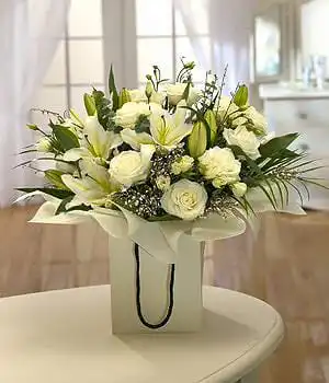 The Flower Bouquet in Gift Bag brings together timeless beauty and contemporary style. Featuring a mix of pristine white lilies, delicate roses, and lush greenery, complemented by filler flowers like baby’s breath, this bouquet exudes elegance and purity. The flowers are artfully arranged and placed inside a white paper gift bag, providing a chic, modern presentation that sets it apart from traditional bouquets.
